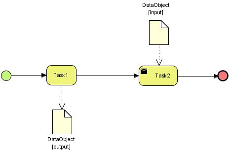 Imagine a simple process, containing a sequence of tasks. 1st task will be used to create a specific DataObject (output of Task1), where 2nd task will use this DataObject to send it to an external partner for example (input for Task2). To show this dependencies DataObject will be attached via DataAssotiation to Task1 (DataObject as target), and in opposite direction to Task2 (Task2 as target):