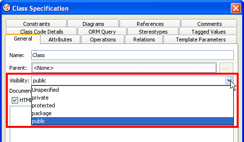 I would like to know how to change the default values which are set (i.e. public instead of private) for class and attribute specification dialogs.