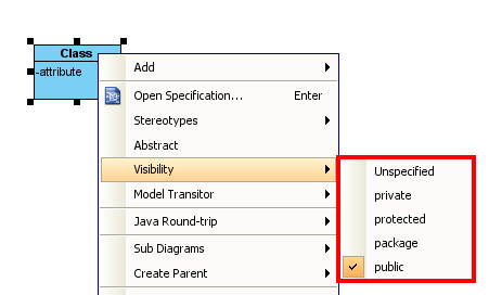 For the attributes, you can also change from private to public simply by typing “+” before the name of the attribute. Below are the the symbols for the visibility of attributes: